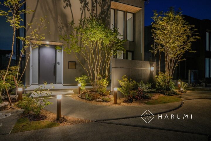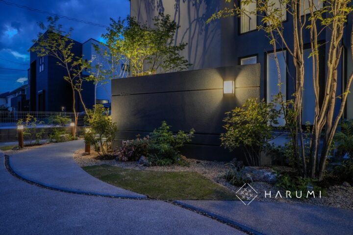 プライバシーは確保しつつ、植栽と照明でやわらかな雰囲気を演出。
