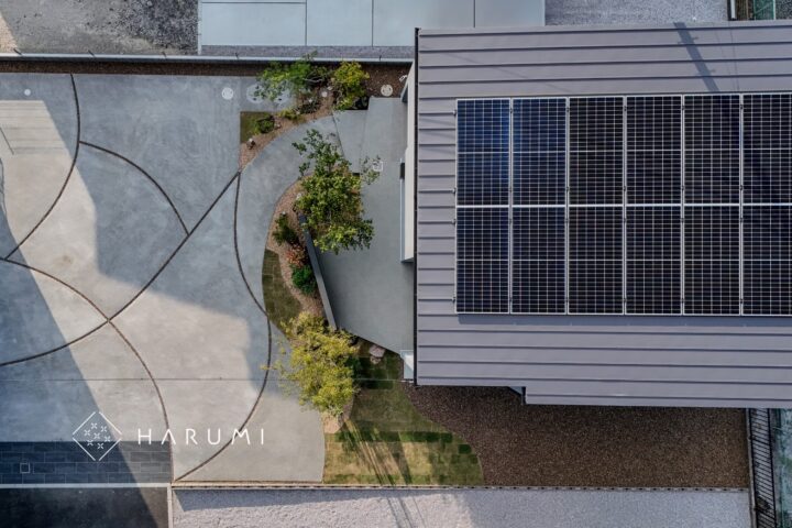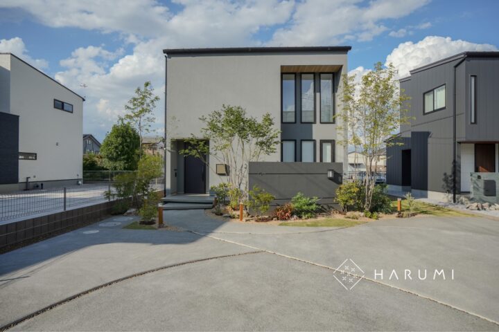 駐車スペースは全面洗い出しコンクリート仕上げとし、スリットラインで特別感を表現することでモダンな住宅を”グン”と引き立てます。