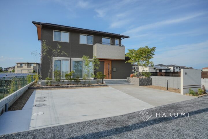 広々とした駐車スペースは、土間コンクリートと洗い出しコンクリート仕上げを組み合わせすっきりとした印象に。