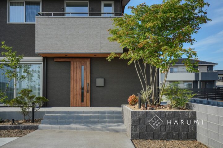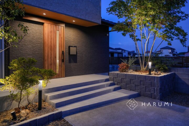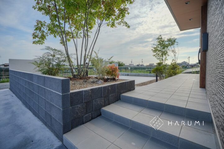 車両の乗入れと庭先までの動線確保に配慮し、一部駐車場を延長し家族の生活に寄り添ったエクステリアを目指しました。